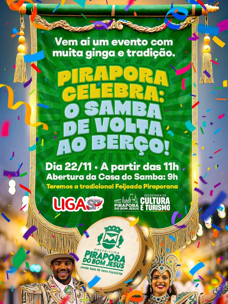 Sob o nome de “Pirapora Celebra: O Samba de Volta ao Berço!”, a prefeitura de Pirapora do Bom Jesus e a Liga das Escolas de Samba de São Paulo prepararam uma grande homenagem ao ‘Território Sagrado do Samba”, antecedendo o Dia Nacional do Samba comemorado no dia 2 de dezembro.