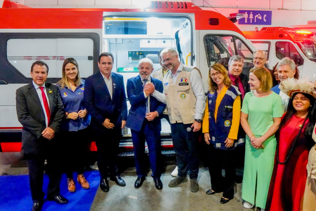 Prefeito Gregorio Maglio com o presidente Lula e membros do governo federal com a nova viatura do SAMU de Pirapora
