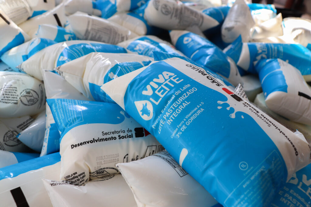 O leite distribuído é pasteurizado e enriquecido com ferro e vitaminas A e D, ampliando seu valor nutricional e contribuindo para o desenvolvimento infantil e a saúde da população idosa.