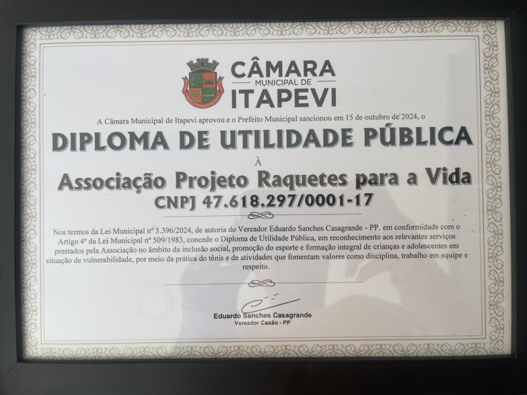 O projeto Raquetes para a Vida, idealizado e fundado por Adriany Carvalho, recebeu Diploma de Titulo de Entidade Pública Municipal da Câmara Municipal de Itapevi, proposta pelo vereador e Eduardo Sanches Casagrande, conhecido como Casão. O reconhecimento reforça a relevância da iniciativa que, por meio do tênis, transforma a vida de mais de 260 crianças atendidas gratuitamente em dois polos na cidade.
